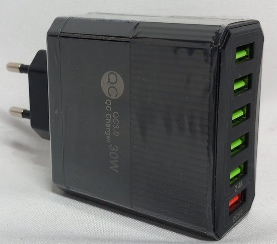 De stekker heeft 6 ingangen, waardoor er meerdere kabels tegelijk gebruikt kunnen worden en bevat 2 snellaadpoorten. Met deze snellaadingangen is de batterij van uw apparaten extra snel volledig opgeladen.